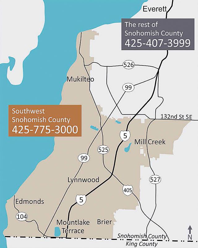 In southwest Snohomish County, dial 425-775-3000. In the rest of Snohomish County, including Everett and areas north and east of the city, dial 425-407-3999. If you’re not sure which 911 area you live in, go to gismaps.snoco.org/non-emergency. Consider programming the number into your smartphone.
