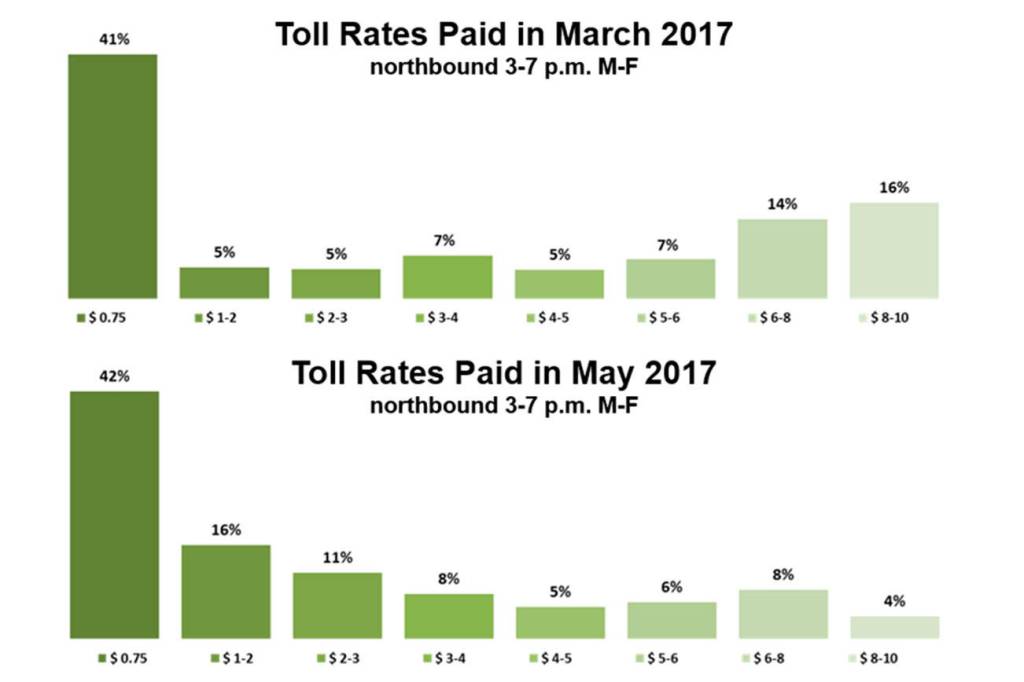 In May, that costliest tier dropped to 4 percent of paid tolls, according to numbers provided by the Washington State Department of Transportation. Tolls in the $6 to $8 range also dropped.