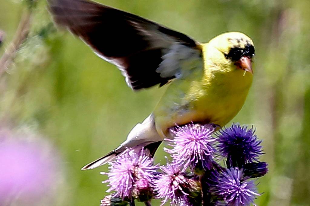 A goldfinch feeds Saturday morning on Leque Island in Stanwood on July 8. (Kevin Clark / The Herald)