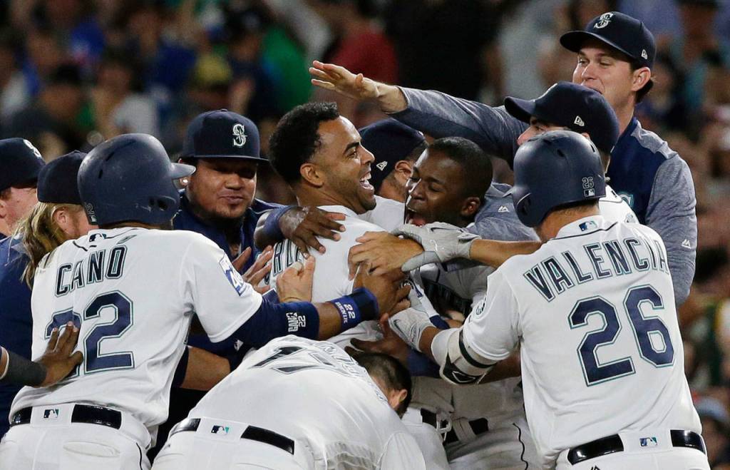 Danny Valencia and Mitch Haniger hit run-scoring singles in the inning.