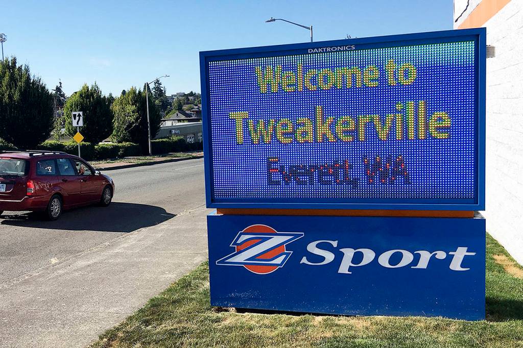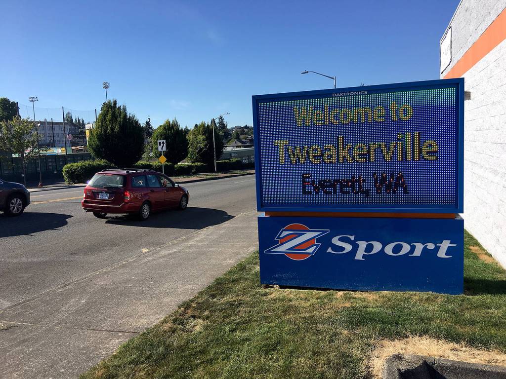 Everett business owner Gary Watts started displaying a “Welcome to Tweakerville” message on his computerized reader board this week. It’s a social commentary on the level of illegal drug use in the city. (Jim Davis / HBJ)