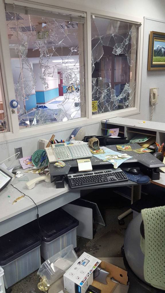 Photos show shattered windows and floors littered with glass. Furniture was tipped over and fire extinguishers discharged throughout the school. It appears the vandals put an extinguisher through a fish tank near the front office, and plugged up a sink left running to flood. Nearly every interior window — big windows around the office and library, and small windows in classroom doors — was broken. The vandals are believed to have gained access by breaking through an exterior window.