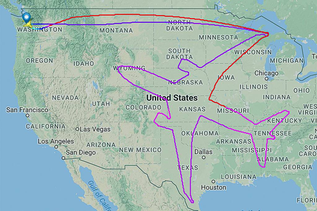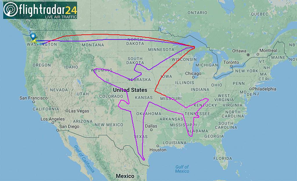 The flight path is only visible through tracking websites like FlightRadar24. The wings stretch from northern Michigan near the Canadian border to southern Texas. The tail touches Huntsville, Alabama. The nose points toward the Puget Sound region.