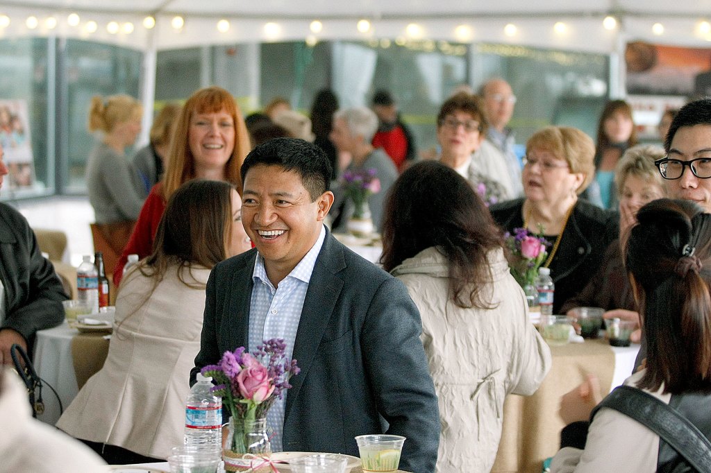 Developer Lobsang Dargey (center) attends an event at Potala Village in Everett in 2015. (Ian Terry / The Herald)