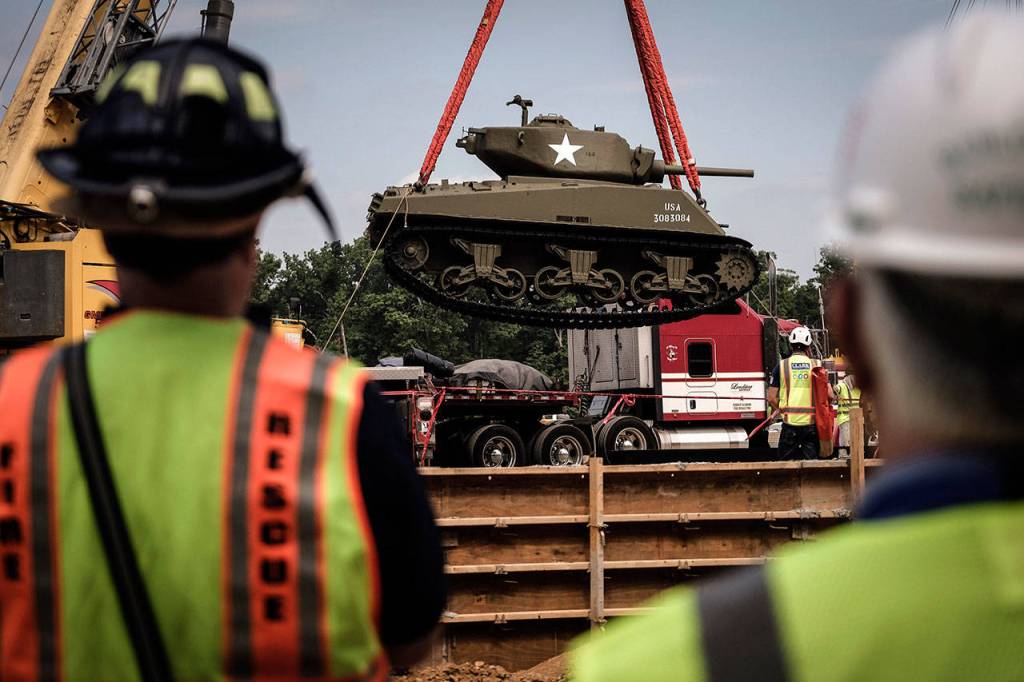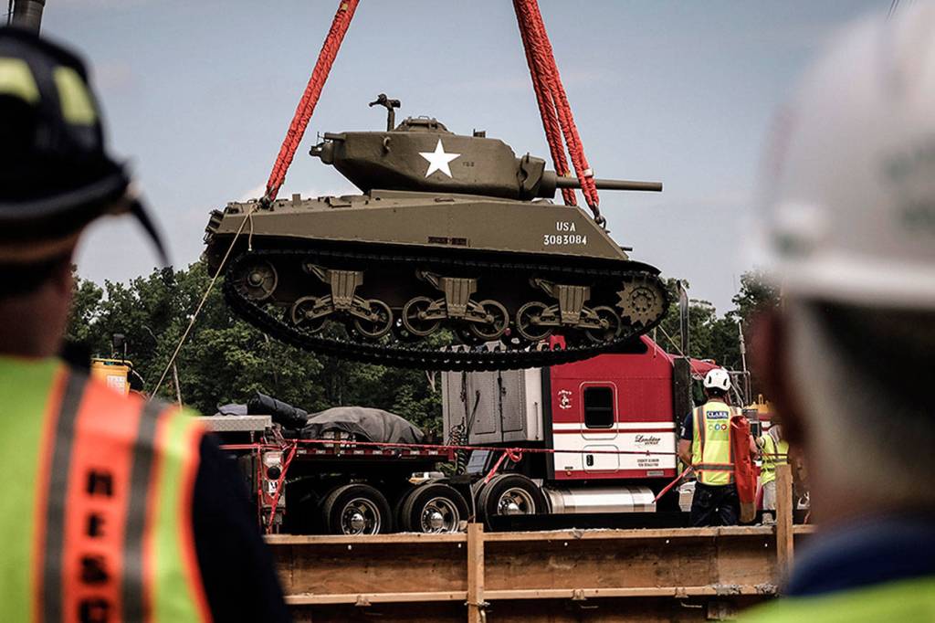 At 10:17 a.m. Thursday, Allen Pinckney, deputy director of the museum, announced to those gathered at the construction site: “The Sherman tank is here!”