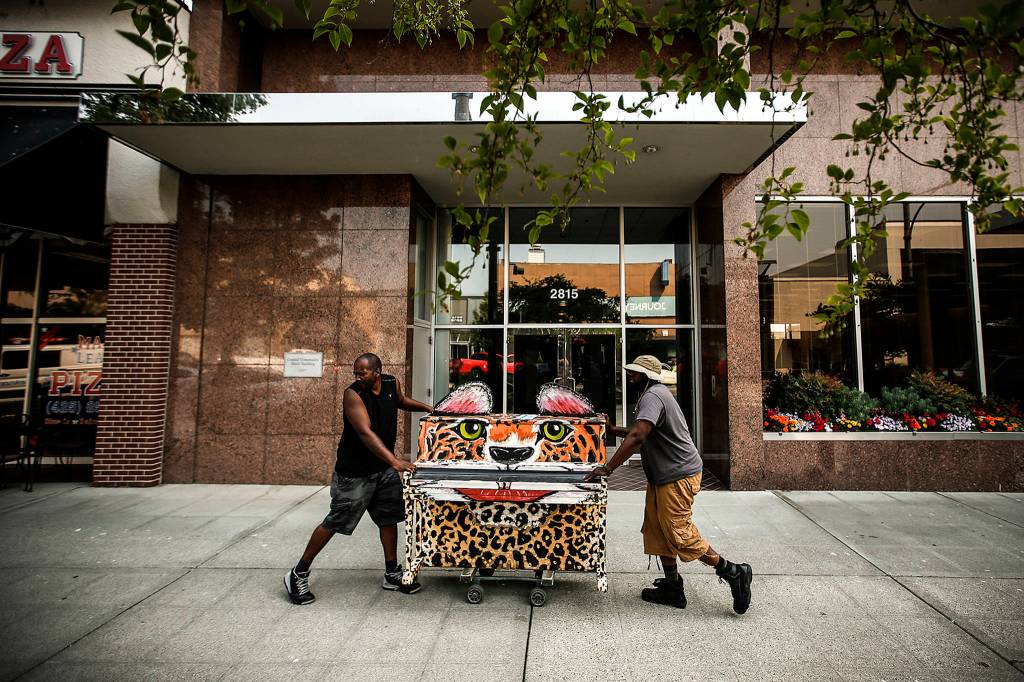 Piano movers Alton Johnson (left) and KJ Butler roll a piano down Colby Avenue in Everett for installation on Aug. 2. (Ian Terry / The Herald)