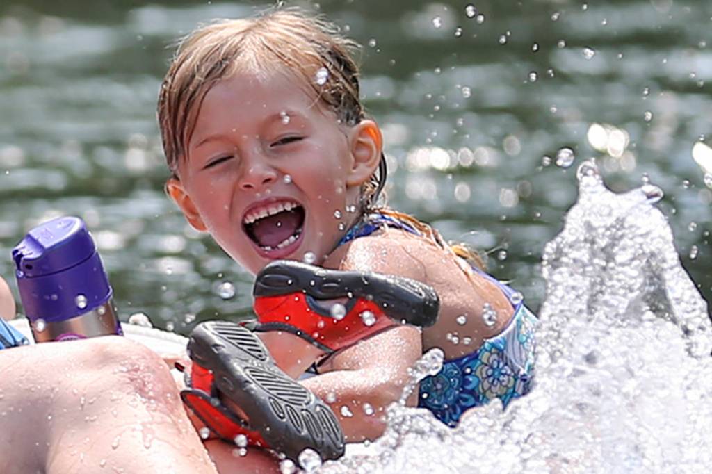 Sarah Schurman, holding Ford Schurman, 3, and Jordan Nettles, 5, play in the waters of the Pilchuck River in Machias on Aug. 2. (Kevin Clark / The Herald)