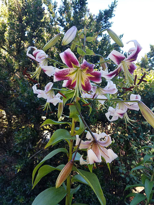 What: Lilium “Leslie Woodriff” was named in honor of Leslie Woodriff, the father of the oriental hybrid lily. This lily, which is part of the orienpet hybrid group, looks magical when a number of them are planted together. The orienpet lily is a cross between oriental and trumpet lilies. In addition to having great beauty, they perform a service to the ornamental border, in that they bloom after asiatic but before the oriental hybrids, extending the lily-blooming season. The color of “Leslie Woodriff” seems to change from purple to cherry red depending on the light. Its white edges and yellow green centers add to its overall appeal. It also is a Lily Society Hall of Fame winner.