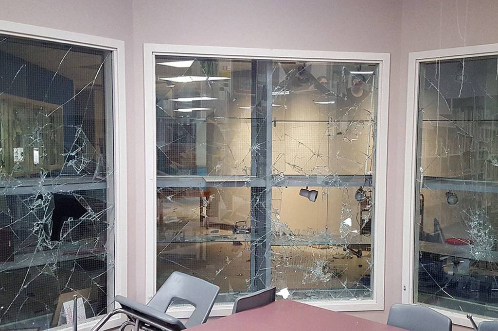 Dozens of windows were broken, along with trophy cases. The vandals destroyed the school’s fish tank and wrote graffiti in paint and marker on walls and desks. The graffiti included racial slurs and obscene drawings, police reported.