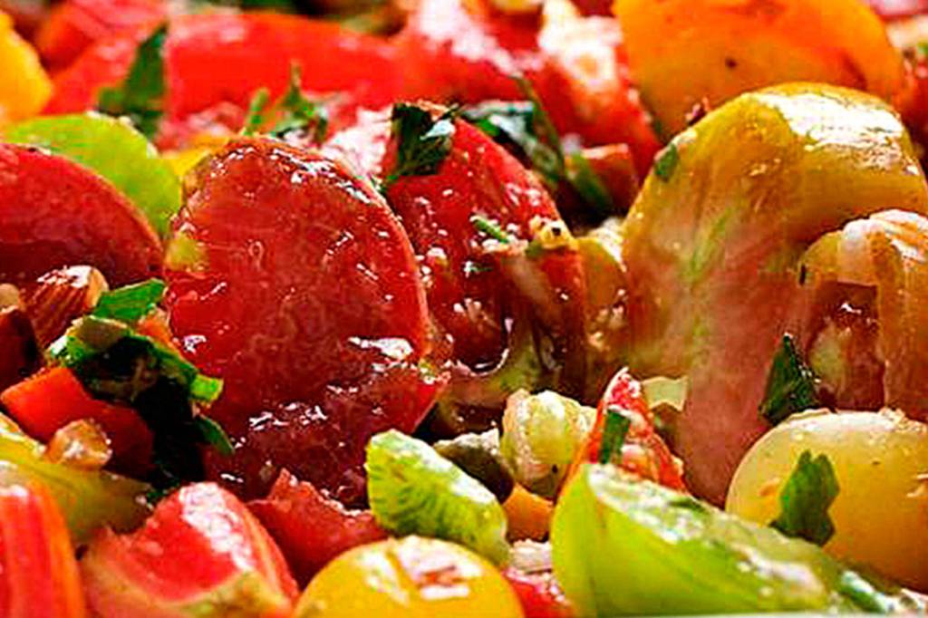Tomatoes with capers, almonds and herbs offer a no-fuss delight with big flavors. (Photo by Deb Lindsey for The Washington Post)