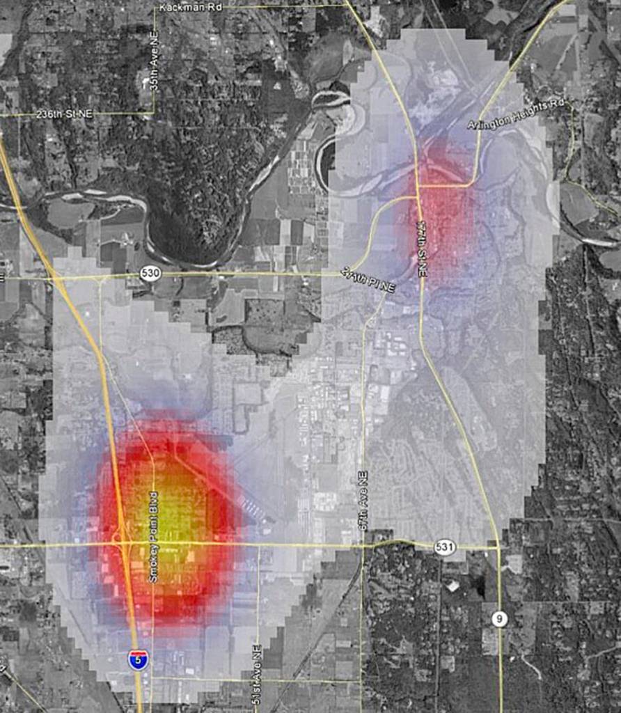 A “heat map” shows the concentration of drug-related crimes in Arlington. The highest concentration is in Smokey Point. (city of Arlington)