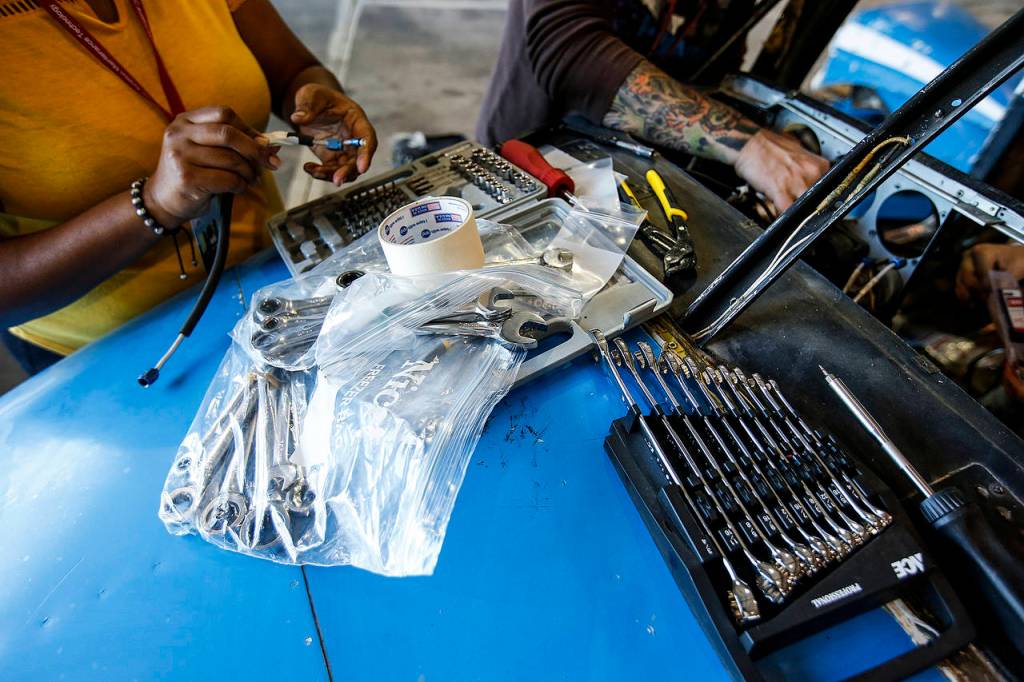 Tools are layed out as students work on a plane during a class at Everett Community College’s new avionics program. (Ian Terry / The Herald)
