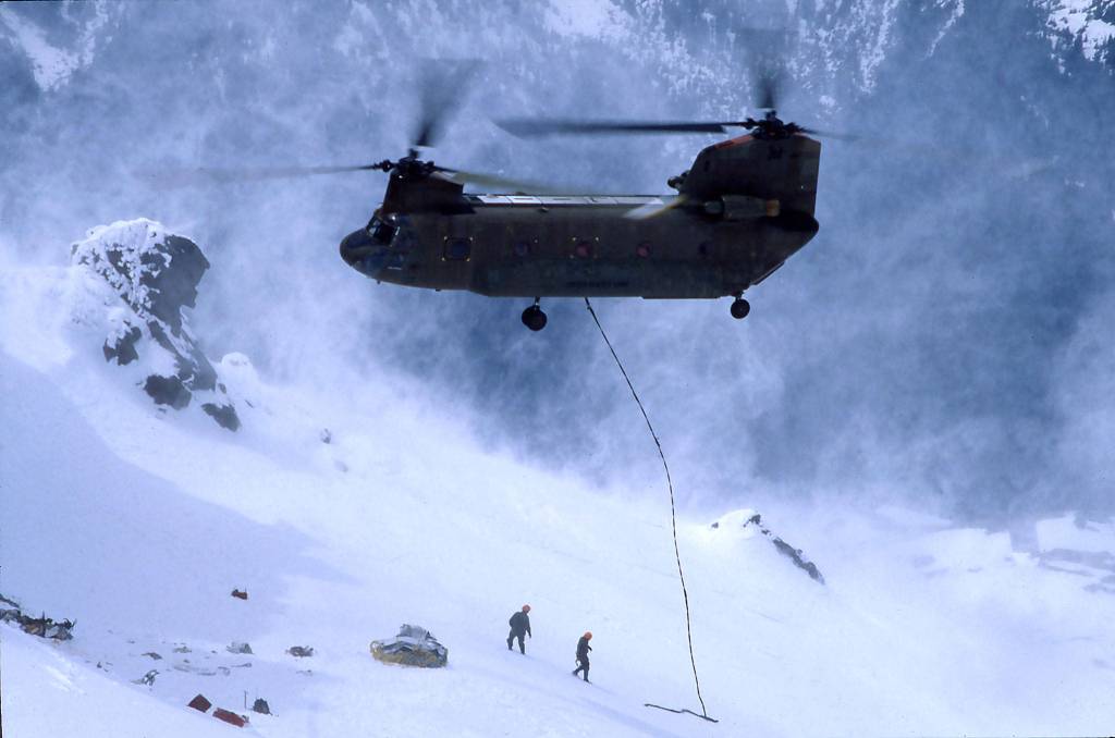 Rescuers carried the man into the helicopter. As they took off, the chopper flipped. They were upside down over a massive crevasse. Rotor blades hit the side of the mountain and broke off.