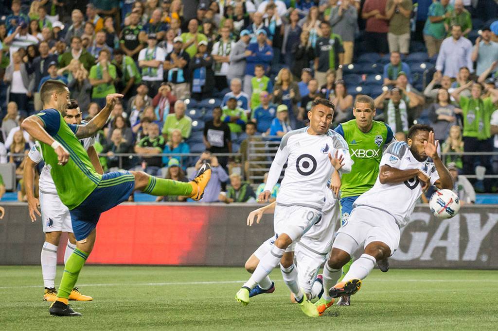 A corner kick by Seattle’s Joevin Jones floated into the penalty area, and Minnesota’s Jermaine Taylor was called for a hand ball in a scrum of players battling for possession.