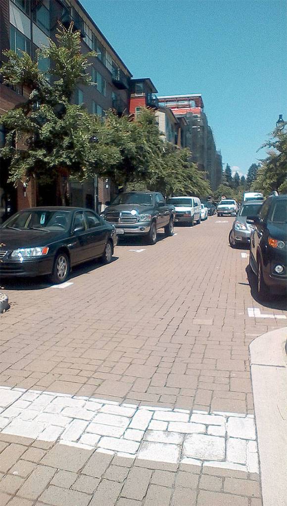 Like roundabouts, the multiway boulevard aims to slow traffic down. In Bothell, that means very narrow access lanes where all the parking is parallel and bicycles share the same space as vehicle traffic.