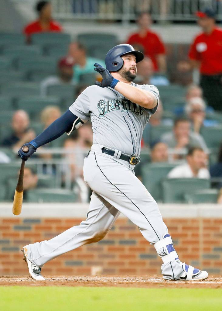 Seattle’s Yonder Alonso (10) hits a run-scoring double in the sixth inning of the Mariners’ 6-5 win over the Atlanta Braves on Monday in Atlanta. (AP Photo/Todd Kirkland)
