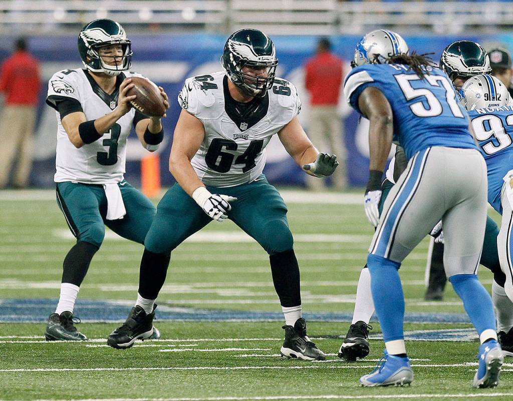 Philadelphia’s Matt Tobin (64) blocks for quarterback Mark Sanchez (3) in a Thanksgiving Day game in Detroit on Nov. 26, 2015. The Seahawks acquired Tobin and a 7th-round pick from the Eagles on Monday for a 5th-round selection. (AP Photo/Duane Burleson)