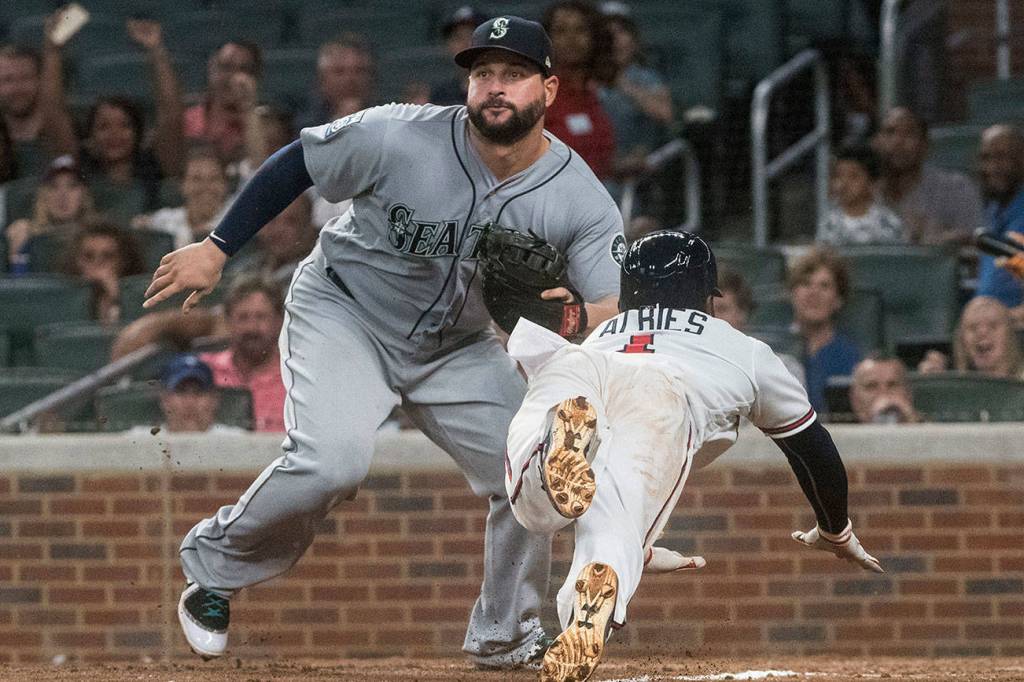 Third baseman Kyle Seager dropped a throw with two outs in the sixth inning when the Mariners had Ozzie Albies trapped in a rundown between third and home.