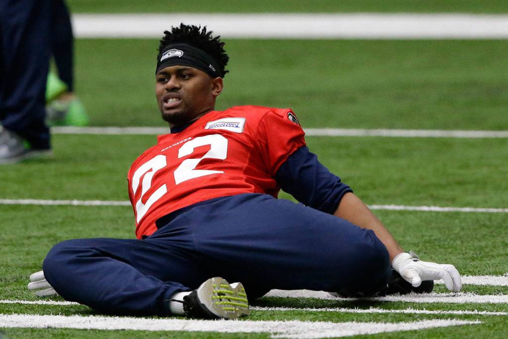 Seahawks running back C.J. Prosise stretches at the start of practice on Jan. 10, 2017, in Renton. (AP Photo/Ted S. Warren)