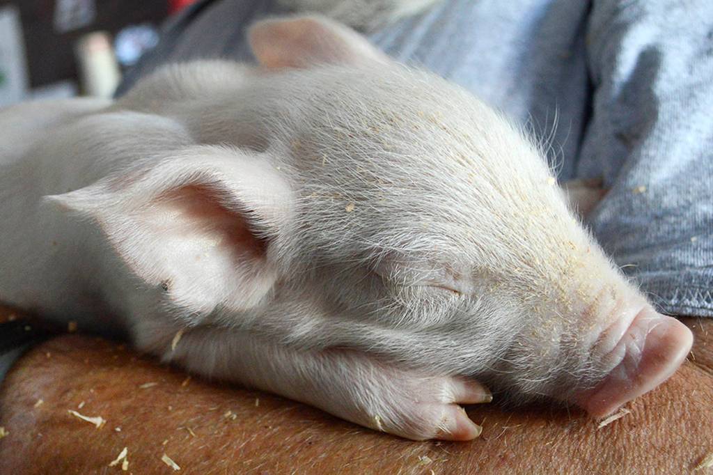 The sickly piglet was one of the newborns Ed Miller, of Granite Falls, brought to this year’s Evergreen State Fair. He brings a sow and her litter every summer.