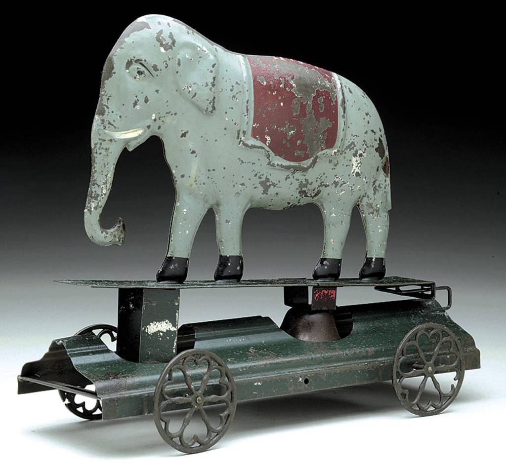 The Gong Bell Co. of Connecticut made the first one. It was an iron four-wheel platform, holding a bell and an animal. The animal kicked or hit the bell when the platform moved. A popular bell toy featured an elephant that stepped on the bell to make it ring. The 9½-inch-long toy is made of decorated metal. It was estimated to be worth about $800 to $1,200.