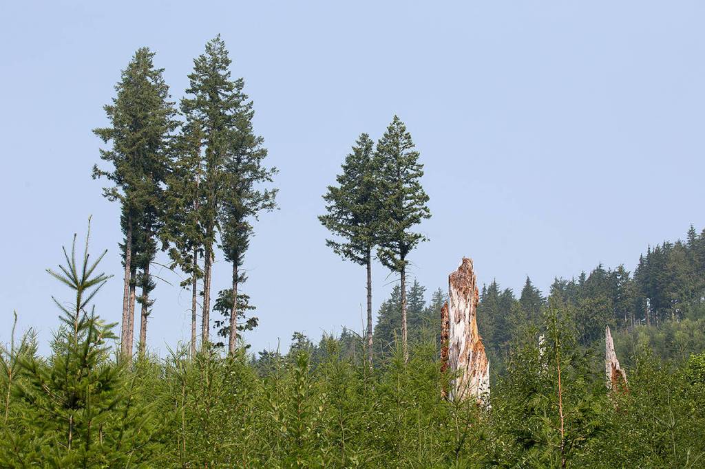 Snags and trees, left over from the previous logging, tower over the new plantings in Grandview Unit 2 on Aug. 3 in Arlington. (Andy Bronson / The Herald)