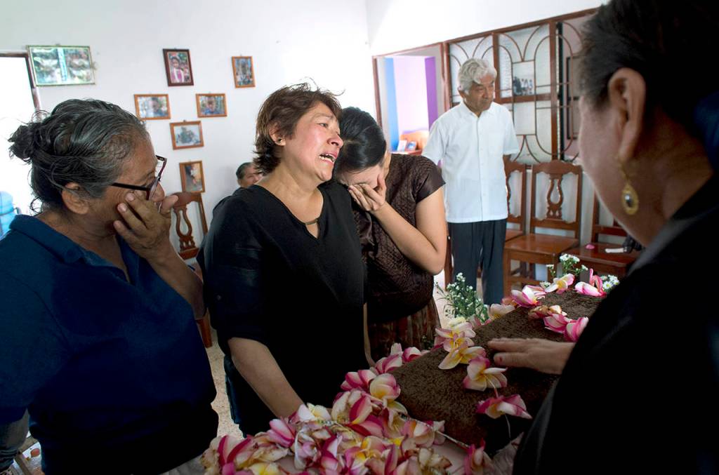 Family members grieve over the coffin containing the remains of 64-year-old Reynalda Matus during a wake in Juchitan, Oaxaca state, Mexico, on Saturday. Matus was killed when the pharmacy where she worked nights collapsed during Thursday’s massive earthquake. (AP Photo/Rebecca Blackwell)