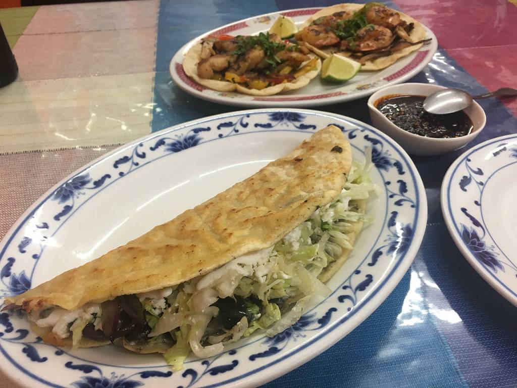 His suggestions covered almost any inclination: the Cubano torta, basically a meat-lovers sandwich; the chilaquiles, a breakfast-for-dinner plate of in-house quartered and lightly fried tortillas with fried steak and eggs; huitlacoche, commonly called the unappetizing “corn smut,” is the name for a fungus considered a delicacy that grows on maize (corn); and the fish and shrimp (camarones) tacos were must-haves.