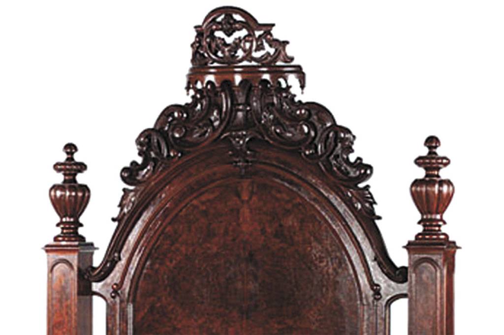 The H.B. Mudge Furniture Co. of Cincinnati designed and made a Victorian suite consisting of a washstand with mirror, commode, dresser and a bed with a high, carved headboard and footboard. It descended in the Mudge family and was auctioned by Cowan Auctions of Cincinnati for $5,400 (includes buyer’s premium). The company was founded in 1837 and made many kinds of household furniture.