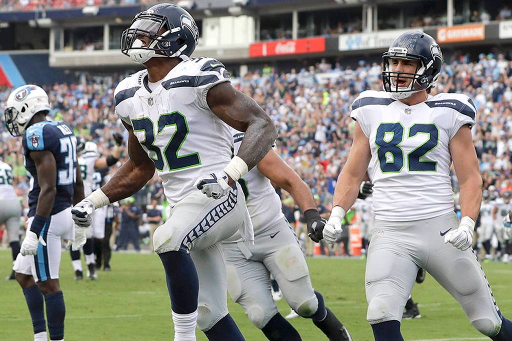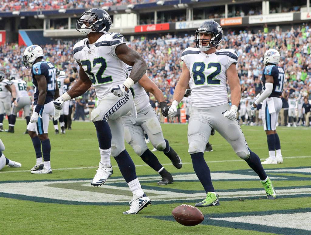 Jimmy Graham had five catches for 10 yards for the season until he caught Wilson’s pass and rumbled 26 yards to the Titans 11-yard line on the opening drive of the second half. Without huddling, Wilson then flipped a throw over the middle to rookie Chris Carson. The seventh-round pick started again and played most of the game as Seattle’s lead running back while Thomas Rawls got just a couple snaps and Eddie Lacy was active yet didn’t play at all. Carson caught the pass and then made a lightning-quick move past the Titans defender for a 10-yard touchdown. The Seahawks led 14-9.