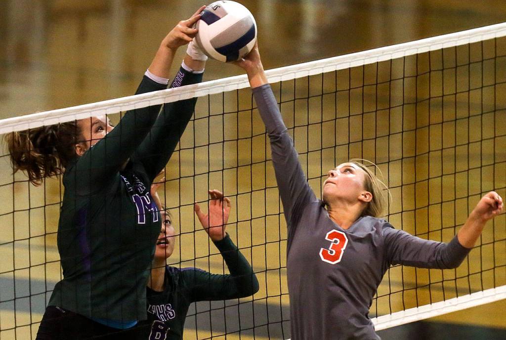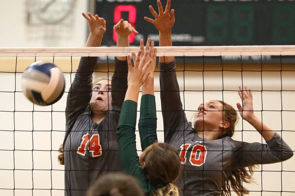 Stanwood’s Emma Bash (left) and Stanwood’s Taylor Lamb block Edmonds-Woodway’s Elizabeth Perenchio during a match Sept. 28, 2017, at Edmonds-Woodway High School. Stanwood won in straight set. (Kevin Clark / The Herald)