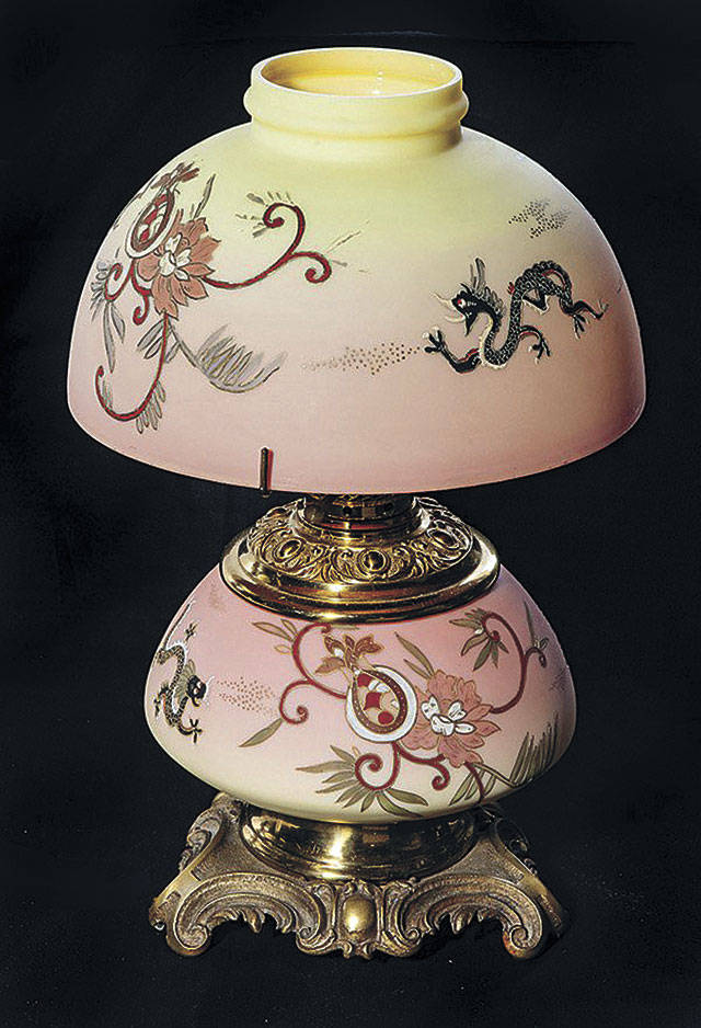 A Mt. Washington student lamp made of Burmese glass sold at an Early auction in Ohio for $3,335. It was decorated with Japanese dragons and an imaginary flower.