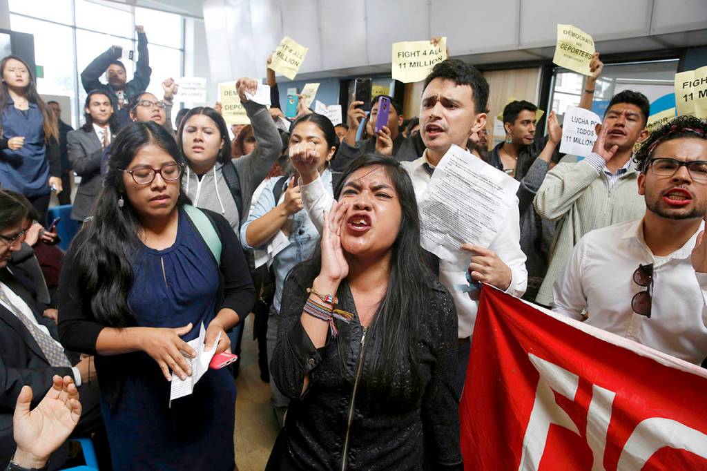 In this Sept. 18 photo, protesters yell as House Minority Leader Nancy Pelosi (not shown) tries to speak during a press conference on the Deferred Action for Childhood Arrivals, or DACA program, in San Francisco. (Lea Suzuki/San Francisco Chronicle via AP, File)