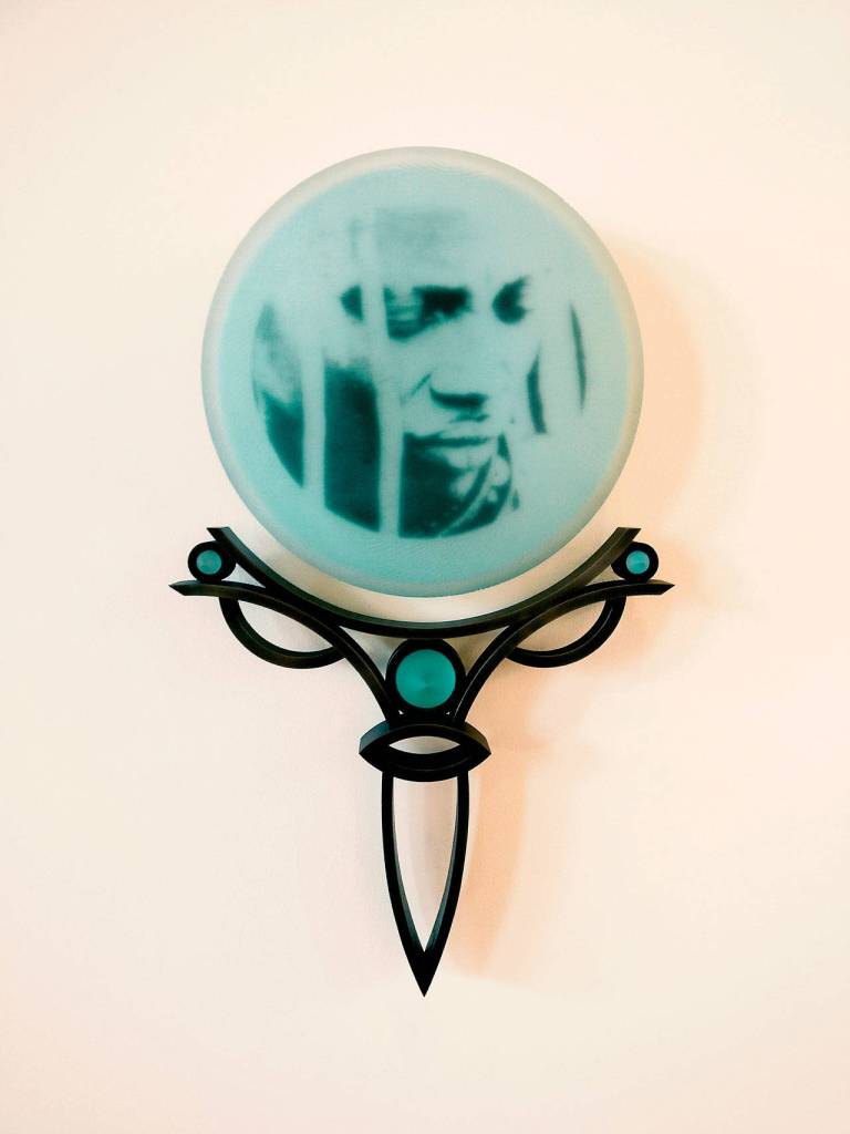 To create portraits from their photos, the artists incorporate a screen-printing technique and fire glass enamels to make the image appear on the base of a glass sculpture, which incorporates metal.