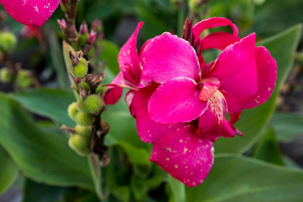The house sits on a double lot. In back is a patio, fire pit and horseshoe game. The side yard has tayberries, rhubarb, roses and hostas. In front are colorful cannas native to North Carolina, where Fran is from. Still to come, someday, is her dream of a country porch.