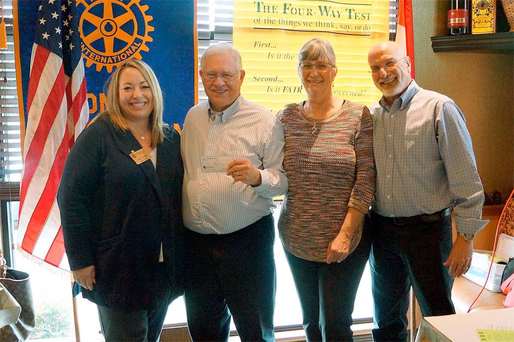 The Rotary Club of Monroe recently presented two $500 checks. One was given to Darian Caldwell in support of the Snohomish Country Rotaract club and their community service projects. The other was presented to board members of the Hands for Peacemaking Foundation for international services in Guatemala, represented by CEO Peter Kinch and Marge and Duane Fairweather.