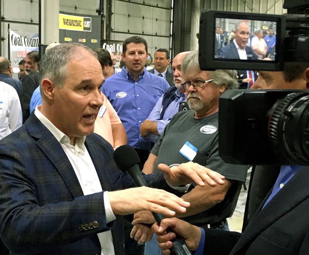EPA Administrator Scott Pruitt talks to a reporter after speaking at Whayne Supply in Hazard, Kentucky, on Monday. (AP Photo/Adam Beam)