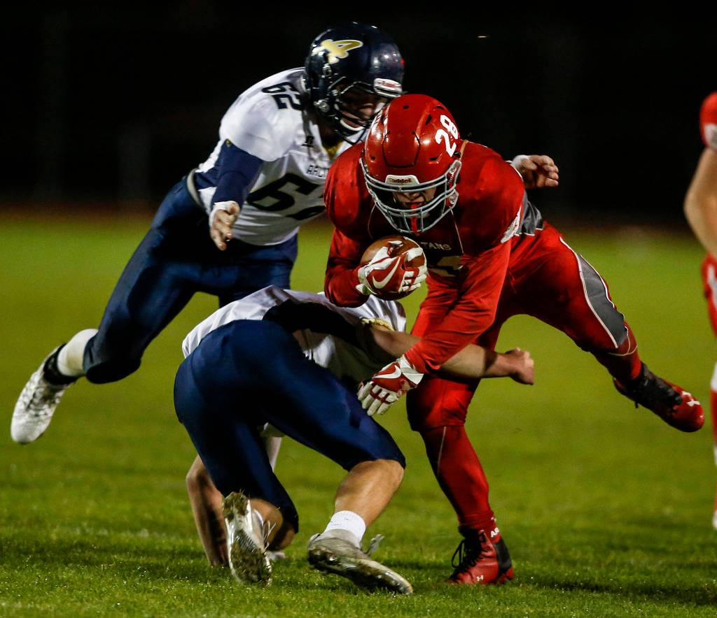 Stanwood (2-5, 2-3) was led by the one-two punch of running backs Tyler Rich and Nick Deline. The bruising Rich ran for 132 yards on 33 carries and scored a touchdown, and he added five catches for 85 yards. Deline, the outside runner, went for 89 yards on 14 carries and scored two TDs.