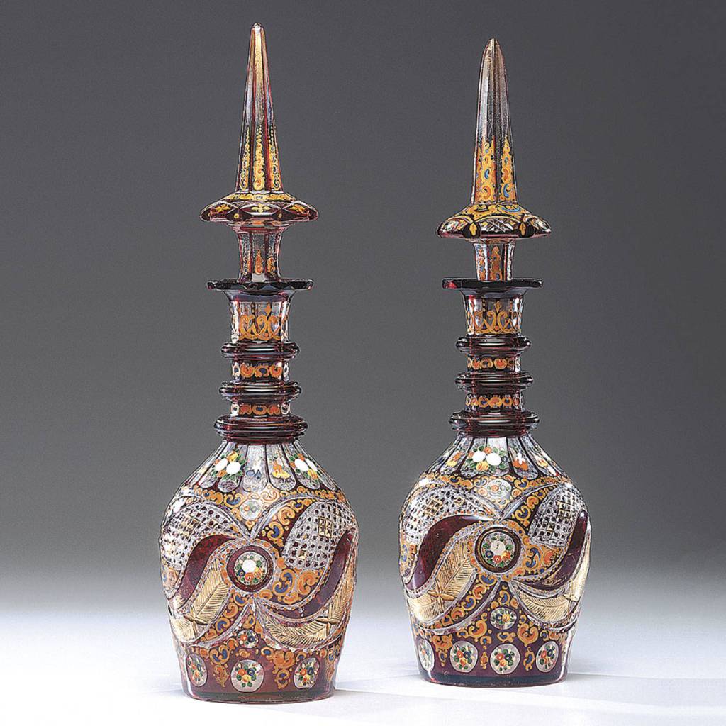 A very elaborate pair of Bohemian flashed glass decanters with cut and enameled decorations sold at a recent Cowan auction for $1,920.