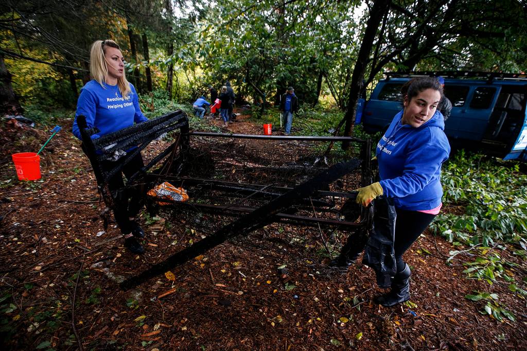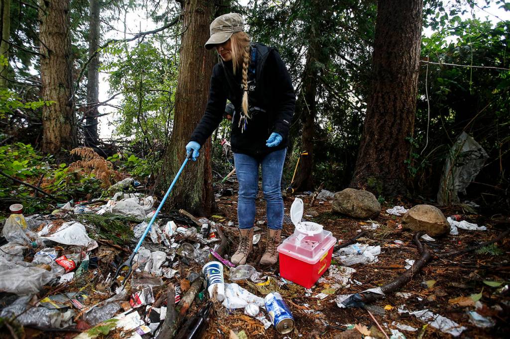 On Friday morning in a misty drizzle, he returned to the camp with tree trimmers, claw grabbers and about 30 volunteers, to remove mounds of trash that line a network of trails. An overturned orange shopping cart sat by coat hangers, wadded tissues and greasy bags of fast food. Empty milk jugs, Big Gulps and cheap beer cans were scattered in the dead leaves. Signs that warned of the coming cleanup had been torn down and used as toilet paper. Everywhere, needles and orange sharps caps carpeted the ground. Some places they were so thick, it was like playing hopscotch to keep them from sticking into your sole.