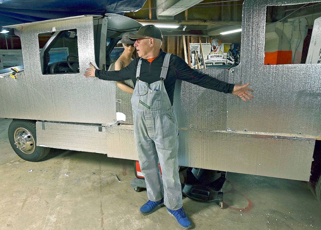 Jeff Daly stands in front of his latest automotive project Tuesday in his studio in Astoria, Oregon. Daly is remodeling an historic train he bought several years ago to travel on an old RV chassis to be used in local parades and other functions. (Colin Murphey /Daily Astorian via AP)