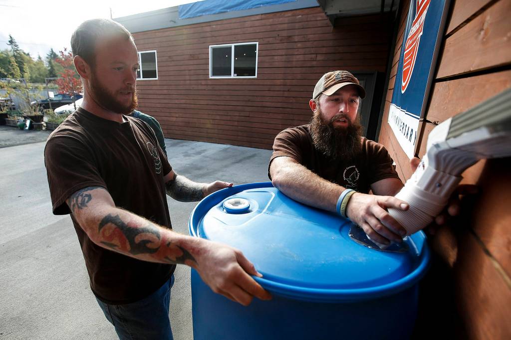 Chris Rodriguez (center) helps Steven Sykes prepare a rain barrel for installation outside Experience Momentum in Lynnwood on Oct. 11. (Ian Terry / The Herald)
