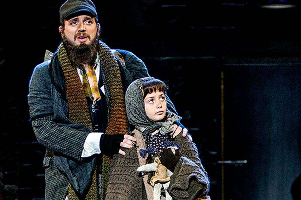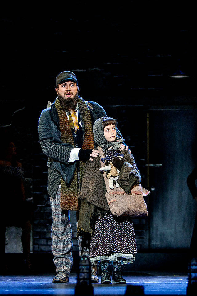 Jewish immigrant Tateh (Joshua Carter) and his daughter arrive at Ellis Island in “Ragtime” at the 5th Avenue Theatre in Seattle. Tracy Martin photo