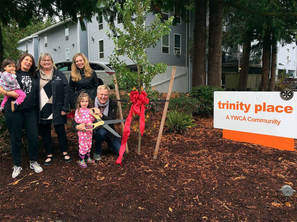 A tree-planting ceremony was held Oct. 19 at the YWCA Trinity Place complex in Lynnwood. An 8-foot Japanese snowbell was planted in front of the apartments. The ceremony honored local businessman Rick Steves, who donated the property to the YWCA earlier this year.