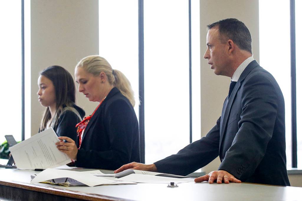 Snohomish County deputy prosecutor Matt Baldock speaks during a sentencing hearing for Cheyanne Jarrell in Everett on Wednesday. (Ian Terry / The Herald)