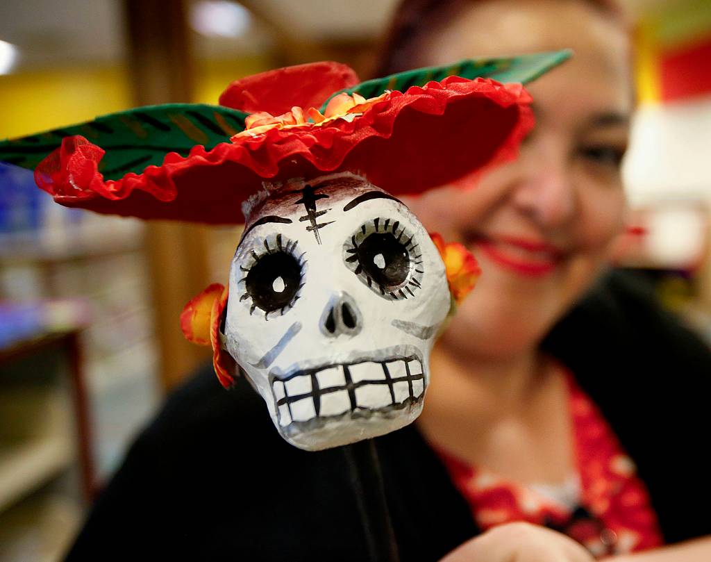Lupita Zamora helps set up a Dia de los Muertos display in the Lynnwood Library on Halloween. (Dan Bates / The Herald)