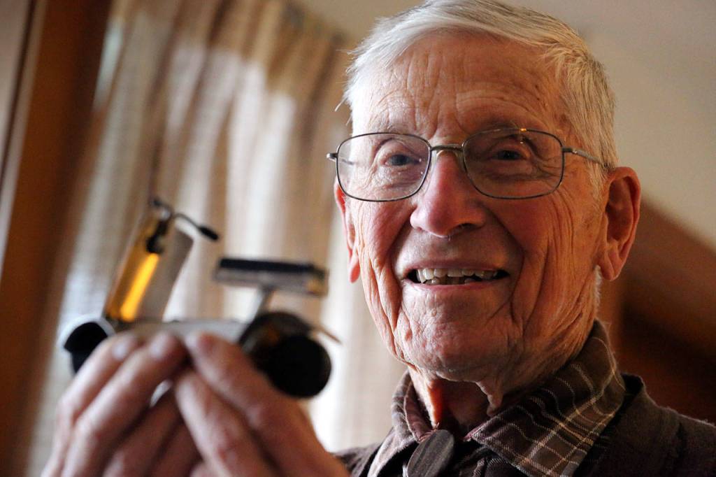 Later, he became an architect, with a head full of inventions. He designed his house, a maze of triangular rooms with no hallways, on the west shore of Lake Goodwin. He drafted the scooter in his 80s. It’s collapsible, brushed aluminum, battery-powered. A friend turned the blueprint into a prototype, dubbed the Lo-Go Motion, at a cost of $3,300. The Daily Herald ran a front-page article on it in 2011.
