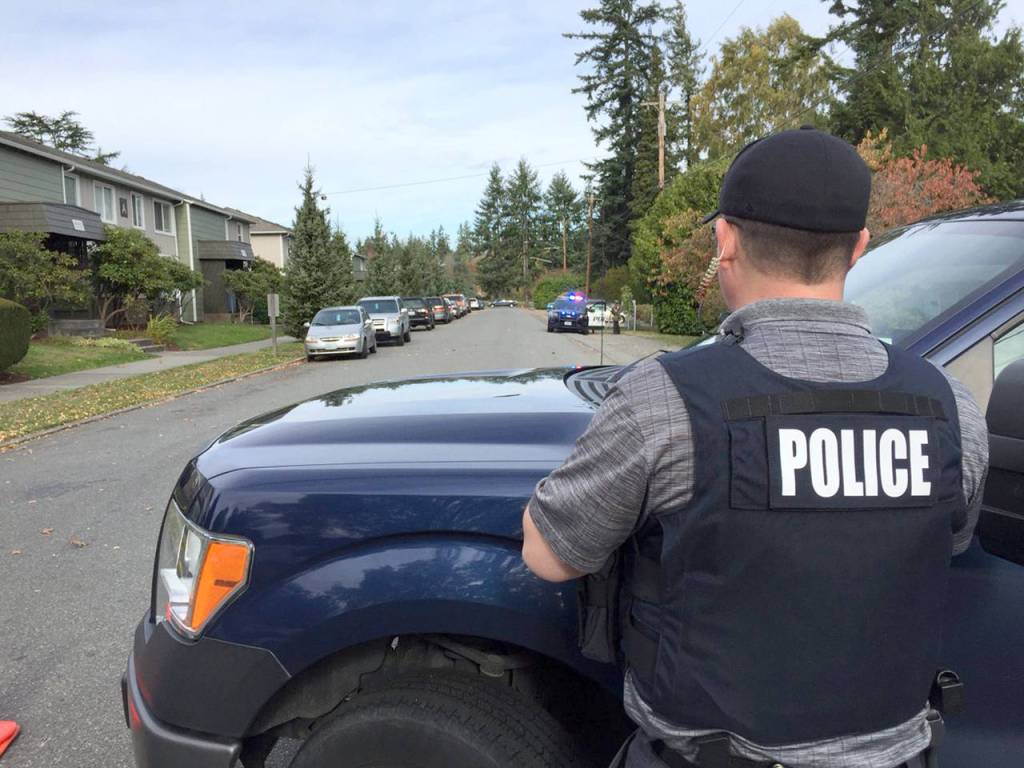 Officers with the Everett Police Department tactical unit enter an apartment building in the 4600 block of Fowler Avenue on Wednesday in Everett. A six-hour standoff at the building might have been the result of a misunderstanding, as there was no evidence a woman had been held against her will as initially reported, Everett police officer Aaron Snell said. (Andy Bronson / The Herald)