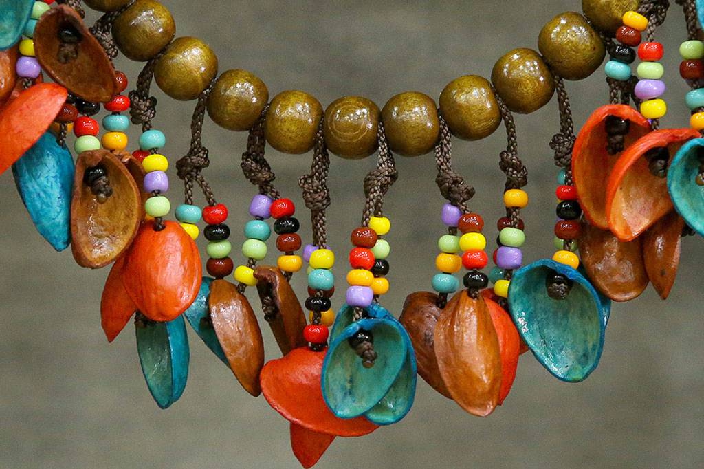 A necklace made with pistachio nut shells is seen at the Fall Home Show in Xfinity Arena on Oct. 27. (Andy Bronson / The Herald)