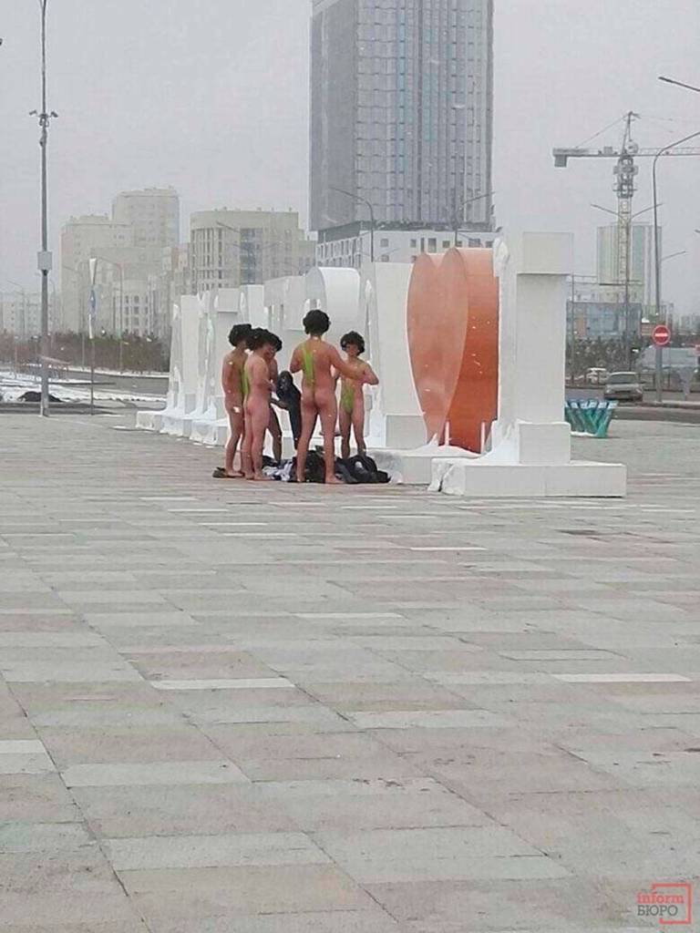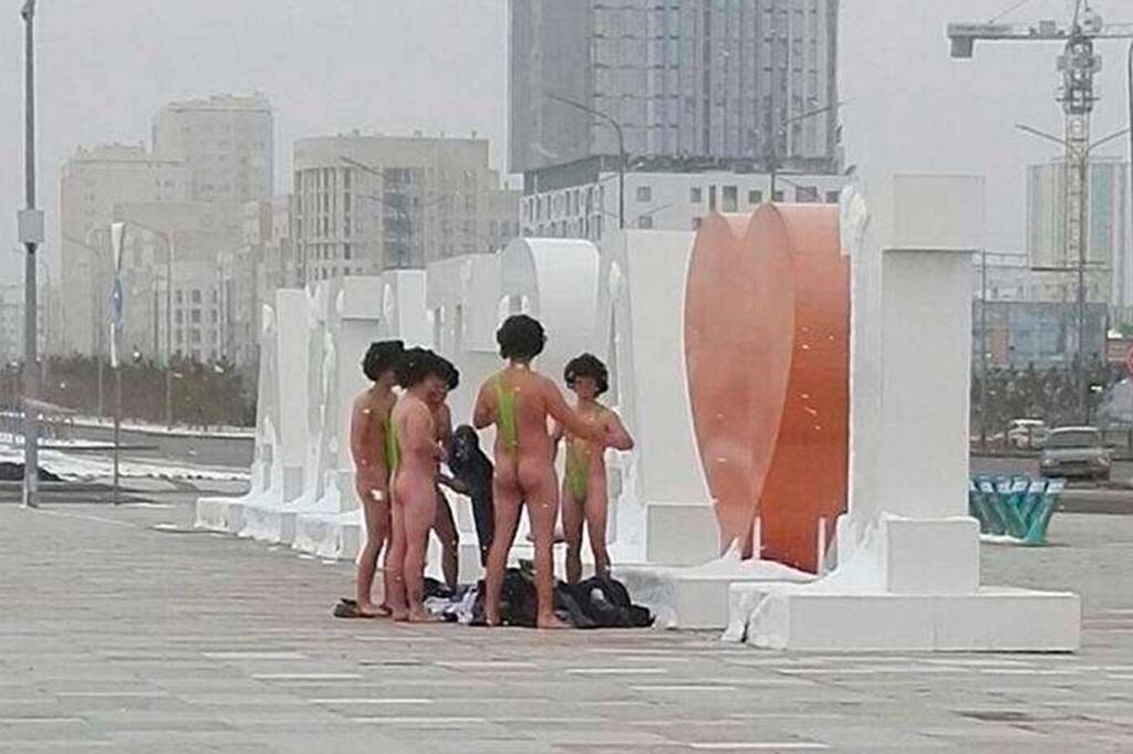 Sporting lime green “mankinis” and black wigs, the men had hoped to take a picture in front of the “I Love Astana” sign.